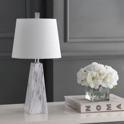 Modern and eye catching, this chic table lamp features an elegant resin base in mixed shades of white and gray to create the effect of marble, but without the inconsistencies inherent in natural stone. This lux finish, coupled with the geometric faceted pyramid silhouette, evokes a modern interpretation of a neoclassical design. The white fabric shade diffuses soft light into any living space, in contrast to the geometric edges of the lower design and the lamp is topped with a matching marbleized resin finial.
