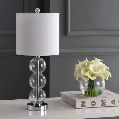 Combining a playful elegance and luxe materials, this stacked sphere glass table lamp will gracefully light any space. Taken from Art-Deco inspiration, its gracious silhouette is created by the linear geometry of three symmetrical curves, as if containing identical spheres. Finished with chrome hardware, the look is both elegant and statement-making.