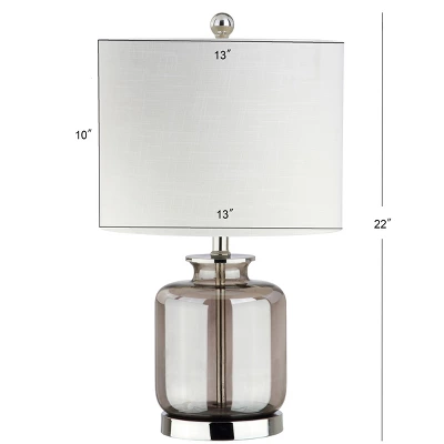 Inspired by collectible colored glass vases and bottles, the smoked glass table lamp is a perfect accessory for cottage-style interiors. Silver fittings, gray glass, and an off-white cotton hardback drum shade update the romantic vintage look. A silk-wrapped cord completes the elegant look. Solid design in an elegant sheen dresses up any sofa or couch. 100% cotton hardback drum shade. 60″ silk cord with standard USA 2-prong plug . On-off switch on socket. Takes one maximum 100 watt or equivalent bulb . Eco-friendly 9W LED bulb included. UL Listed. Before cleaning any lamp shade or fixture, disconnect the power source. Wipe with a soft, dry cloth. Avoid the use of chemicals and household cleaners as they may damage the finish.