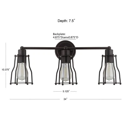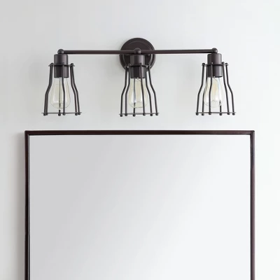 Define your bathroom or vanity space with the handsome industrial look of this dark bronze 3-light sconce, which can be hung in either direction according to your preference. This classic industrial cage bath light features a hand-worked orb-plated frame and round wall plate in an industrial finish. Edison-inspired bulbs add a vintage touch within the fixture, while the machined details of the shade cage evoke the turn of the century, when exposed bulbs were in vogue as only the most affluent households had upgraded to electricity from candlelight. This trend-forward, yet classic style is sure to be a classic for another century to come.