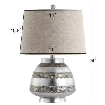 Inspired by the glam rock movement of the 1970s, the midcentury shape and iridescent silver finish of this stunning table lamp will make a statement in any home. Toned down by a natural linen shade, and featuring textured antique silver stripes on the base, this style is balanced in its every design feature. And the elevated details extend all the way to the plug — the cord is silk wrapped and as lovely to display as the lamp.