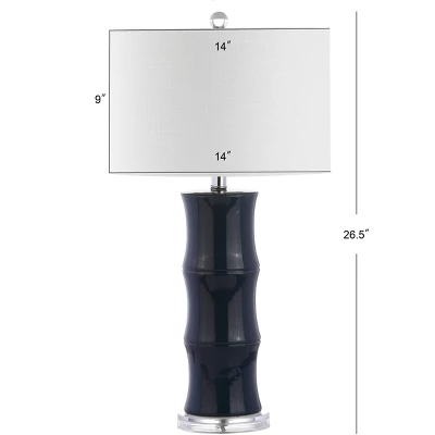 This eye-catching navy ceramic table lamp takes its inspiration from the beauty of natural bamboo. The resulting look is a perfect balance between Asian and modern styles, with a preppy flair. Nickel accents, a crystal base and a white cotton drum shade keep the look contemporary and fresh. A classic bamboo shape gets a modern update in a glazed ceramic table lamp base. 100% cotton hardback drum shade in white. Beautiful to display or easy to conceal: the 60 cord is silk-wrapped. On-off rotary switch on socket. Takes one bulb and compatible with any 9W LED or 60W incandescent or 13W CFL. Eco-friendly 9W LED bulb included. UL Listed. Before cleaning any lamp shade or fixture, disconnect the power source. Wipe with a soft, dry cloth. Avoid the use of chemicals and household cleaners as they may damage the finish.
