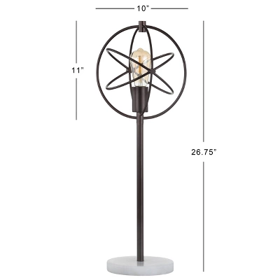 With its caged design and Edison-style bulb, this unique lamp adds an industrial touch. The bronze metal loops orbiting the bulb have a Space Age aesthetic, while the marble base is a sleek detail. This lamp is the perfect accent piece for mid-century modern or industrial style decor. Edison-style LED bulb saves energy; convenient in-line switch. Quality oil-rubbed bronze finish and silk-wrapped cord. On-off in-line switch. Eco-friendly 4W LED bulb included. Takes one bulb and compatible with any 9W LED or 60W TYPE A or 13W CFL. UL Listed. Before cleaning any lamp shade or fixture, disconnect the power source. Wipe with a soft, dry cloth. Avoid the use of chemicals and household cleaners as they may damage the finish.