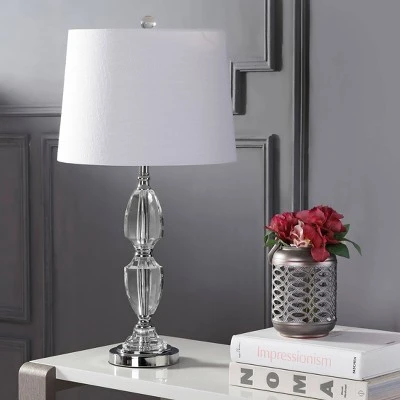 Make room for traditional elegance, as a column of crystal stacks up and sparkles from every angle. The square crystal base of our lamp continues the aesthetic while a slightly tapered linen shade enhances the light’s reflection. Topped with a crystal finish and finished with a silk-wrapped 60″ cord, this lamp will add traditional glamour to any home.
