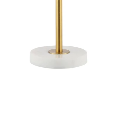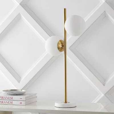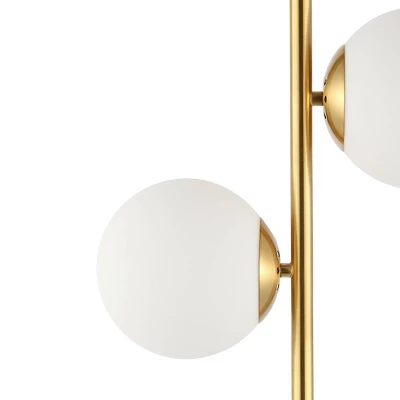 This Art Deco-inspired orb table lamp has a brass finish and frosted glass globes for bright ambient light. Versatile 28″ height is perfect for ambient lighting on a table, desk or console. A vintage, classic replacement to outdated table lamps for an instant French-inspired makeover. Eco-friendly 4W LED bulb included. Takes 2 bulbs and compatible with TYPE “B” 40W or CFL 13W or LED 9W. Color Temperature: 2700K. CRI: 80. Before cleaning any lamp shade or fixture, disconnect the power source. Wipe with a soft, dry cloth. Avoid the use of chemicals and household cleaners as they may damage the finish.