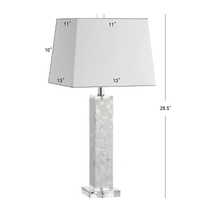 Perched atop an crystal base, this pair of seashell pillar lamps seemingly float in any space with a perfect sheen of mother-of-pearl. Hand-collected shells, polished and cut into tiles are applied in a grid mosaic on the rectangular base, and the shape of the shades mirrors that geometric motif. Accented in chrome finishing’s and an crystal finial, this pair would add a beautiful sheen to a foyer, bedroom, or living space.