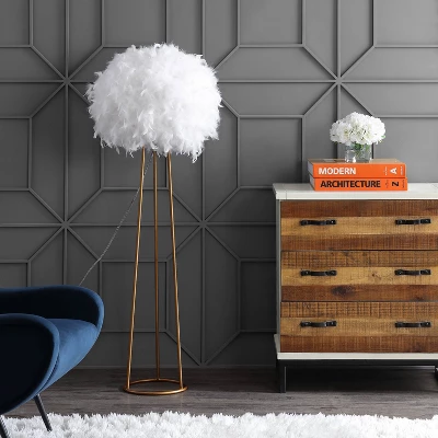 Light as air, this chic floor lamp is charming and contemporary adorned in white feathers. With a single bulb and brass base, the scene-stealing feather dome softens the light while retaining a contemporary aesthetic that blends well with any style of decor. And at only 52″ high, its small scale is well-suited for any floor or room.