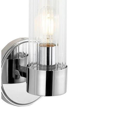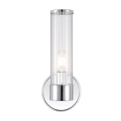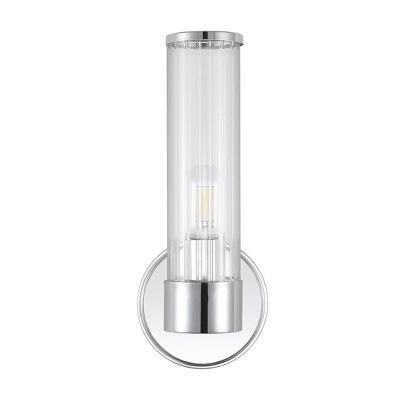 Replace outdated wall sconces or vanity lights with this polished classic for an instant mid-century modern makeover. Quality details include sparkling chrome trim on the glass cylinder, and an Edison-style LED bulb. Our light fixtures work with LED-compatible dimmers; professional installation is recommended. Eco-friendly 4W LED bulb included. Takes 1 bulb and compatible with TYPE “A” 40W or CFL 13W or LED 9W. Color Temperature: 2700K. CRI: 80. Before cleaning any lamp shade or fixture, disconnect the power source. Wipe with a soft, dry cloth. Avoid the use of chemicals and household cleaners as they may damage the finish.