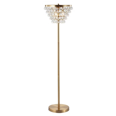 Large crystal droplets catch the light, enhancing the shimmer of this stunning floor lamp and adding timeless elegance to any room. With the shade hanging in five tiers, this floor lamp gives the effect of a chandelier without the hard-wired installation or required high ceilings. At 60″ tall, the scale is perfectly suited for a living room or bedroom.