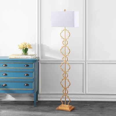 A Mediterranean-inspired classic, this stylish floor lamp features ogee tile forms stacked into a column, finished in gold. Standing tall at 64.5″, this elegant lamp is topped with a rectangular shade to suit traditional and modern interiors. Add a touch of glamour and a hint of Moroccan style to your living room or bedroom with this open-work lamp. Quality details include a foot-step switch and silk-wrapped cord. Eco-friendly 9W bulb included. Takes 1 bulb and compatible with any 12W LED or 100W TYPE “A” or 23W CFL. UL Listed. Before cleaning any lamp shade or fixture, disconnect the power source. Wipe with a soft, dry cloth. Avoid the use of chemicals and household cleaners as they may damage the finish.