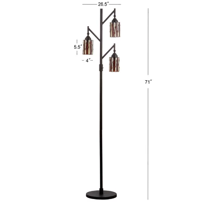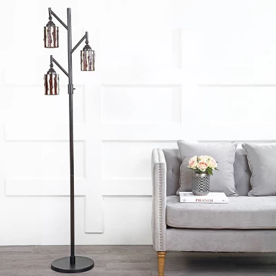 With three lights glowing through the mission-style stained glass design, this floor lamp will stand out in any space. One of the finest techniques to come out of the Art Nouveau movement, the Tiffany-style stained glass technique is steeped in traditional design, though this piece is updated with the functionality expected today — a step-on on/off button, LED bulb compatibility, and a beautiful silk-wrapped cord. Each shade is hand-made by artisans who specialize in the intricate art of stained glass soldering.
