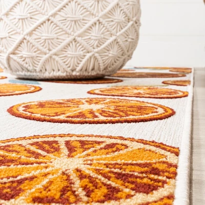 Scattered citrus fruit and leaves add sunny Mediterranean style to your home, updated with modern flair. Our graphic rug will add a bold pop of pattern and color to the living room, dining room, bedroom or office. Perfect for the porch, this pet-friendly and low-pile design is easy to clean.