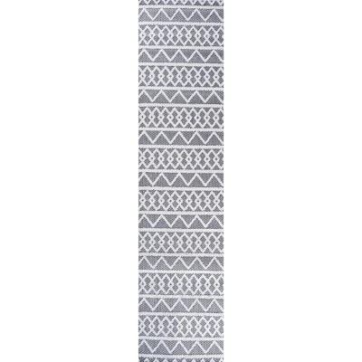 - The deep gray and ivory color scheme is a modern take on neutral geometric rugs