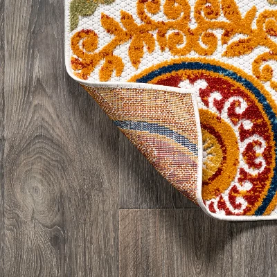 Inspired by antique Suzani patterns, this indoor-outdoor rug will cheer up a kitchen, living room, bedroom or dining room. The multicolored design is an easy maintenance solution for homes with kids and pets. Outdoors, this rug adds a splash of color and Moroccan style to your patio or porch.