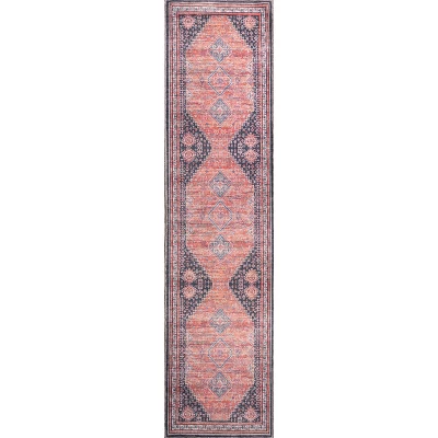 The diamond-shaped medallion in the center of this rug’s design recalls vintage Persian rugs with their vibrant color palettes. A geometric border adds to the vintage charm. This pet friendly rug is forgiving of spills and easy to care for; it’s a versatile classic perfect for a dining room, living room, kitchen, bedroom or porch.