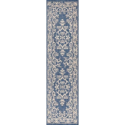 This ornate medallion rug’s filigree pattern adds dreamy Bohemian cottage style to your patio, porch or sunroom. Inspired by Mediterranean wrought iron designs, the ivory pattern on a blue background gives this outdoor rug a hand-woven, vintage vibe. The busy pattern is ideal for your entry, kitchen, hallway, living room or bedroom too. The pet-friendly and kid-proof flatweave design makes it easy to clean, and perfect for the beach house.