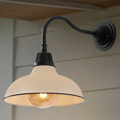 Our vintage metal wall light is the perfect accent for farmhouse designs and shiplap walls. Features a globe LED bulb and painted shade mounted on an angled arm. This outdoor light fixture can also be used indoors for residential and hospitality projects.