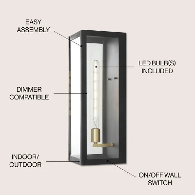 Our stylish black finish gives a minimalist edge to this modern, rectangular light fixture. The tall, Edison-style LED bulb and brass-toned fittings add industrial flair. This outdoor lantern’s clean lines are ideal for a transitional, modern or industrial front entry, walkway or patio.