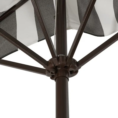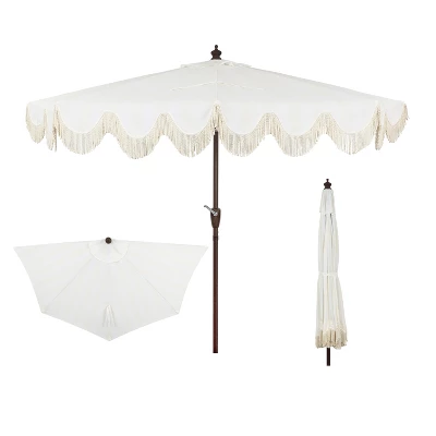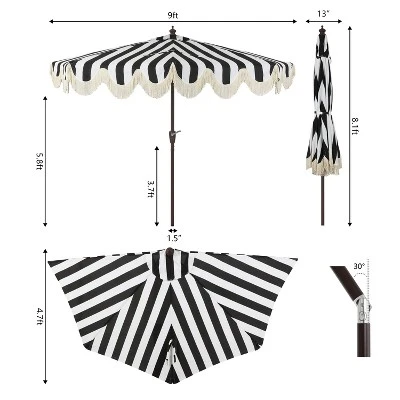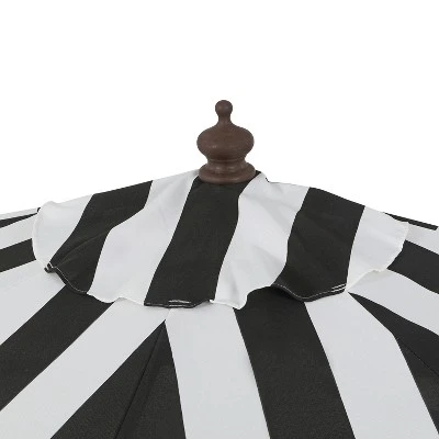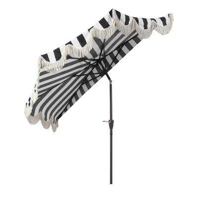 This classic umbrella is the life of the party with its scalloped edges and iconic stripes. The sturdy aluminum frame is covered in durable outdoor canvas and includes a manual tilt mechanism that can block the sun from the left or right. Trimmed in bullion fringe, this umbrella adds designer style to the patio, pool or dining area.
