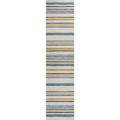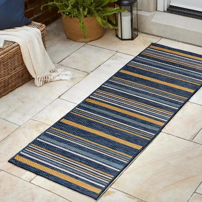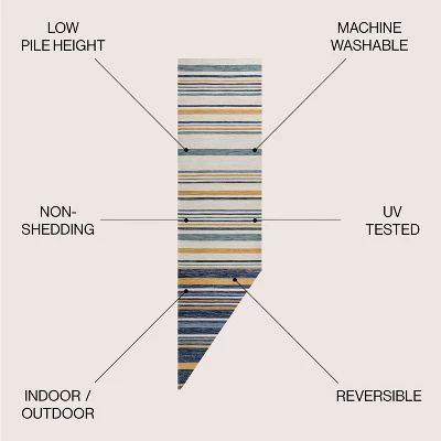 Inspired by ticking stripes, our classic rug features a bold multi-stripe pattern. Woven from synthetic fibers, this easy-care, reversible rug has a casual, coastal vibe. Durable enough for outdoors on a porch, or in the living room, entry, bedroom or dining room.