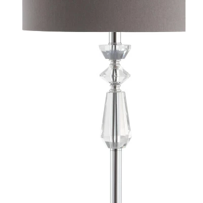 Perfect for rooms with a moody, neutral color scheme in need of a pop of glamour, this floor lamp delivers a lot of style in a classic shape. Accented with a trio of faceted crystal objects at the neck of the base, it is completed with a grey drum shade and chrome body. The crystal finial ties the look together and is seemingly illuminated when the bulb is lit.