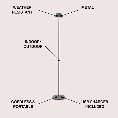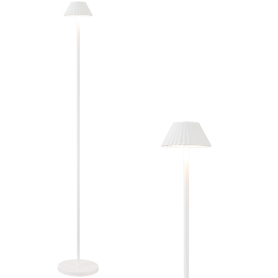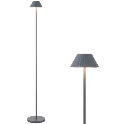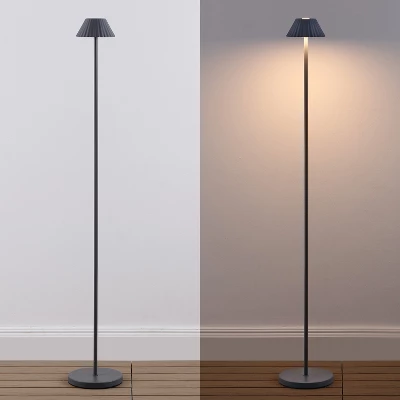 Accent any porch or patio with this modern, minimalist floor lamp. Made from durable aluminum, this mini lamp features a 6.75″ wide base that can tuck into a small space; the pleated metal shade contains a rechargeable battery with a touch sensor switch. Integrated LED bulbs add bright, warm light indoors and out.