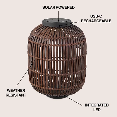 Add global flair to the patio, deck or porch with this modern take on a classic outdoor lantern. Made from durable plastic rattan, this large solar-powered lantern turns on at dusk and off at dawn. It features a bright LED bulb and a battery that can recharge in the sun, or with a standard USB-C cable (not included).