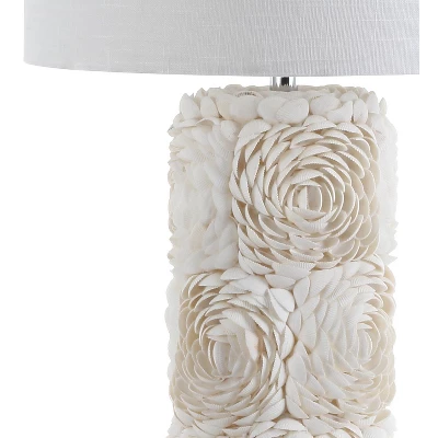 Rosettes crafted by artisans are both coastal and quaint in a mosaic of seashells. With large open blossoms, the romantic stylings of this table lamp come with a white textured cotton drum shade, and an acrylic pedestal and finial. We love how this classic column shape gets a feminine update surrounded by these symbols of the sea!