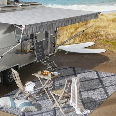 - Inspired by timeless Mediterranean patterns, this indoor-outdoor rug adds neutral gray tones to a kitchen, living room, bedroom or dining room. The dark gray trellis design is an easy maintenance solution for homes with kids and pets. Outdoors, this rug adds classic color and traditional pattern to your patio or porch.