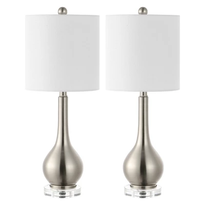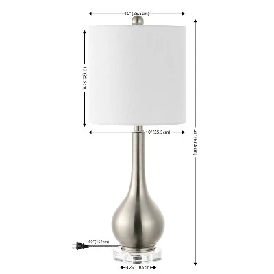 The refined teardrop shape of this 25″ nickel-plated table lamp, combined with a classic linen drum shade, create a compelling blend of traditional and contemporary design that is well suited to a variety of design styles. Accented with chrome-plated fittings, a crystal base and a finial to match, the clean lines of this light fixture will add a fashionable and functional touch to any home.