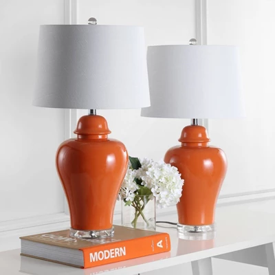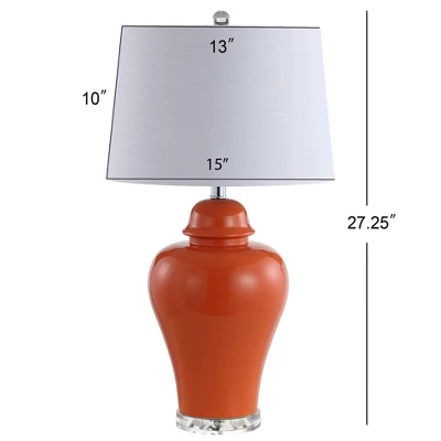 This country-contemporary update of the classic urn table lamp is made of ceramic atop an acrylic base. A bright orange glaze finishes the ceramic, and a crystal finial ties back to the polished acrylic base. Topped with an off-white linen fabric drum shade and finished with a silk-wrapped cord, no detail was overlooked in this classic design.