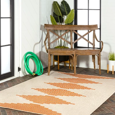 Inspired by Moroccan rugs, our modern striped rug has a durable low pile. The geometric pattern is woven with a simple two-tone effect; our diamond stripe design has mid-century flair. Add graphic punch to your living room, bedroom, dining room or porch with this easy-care rug