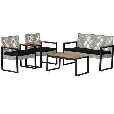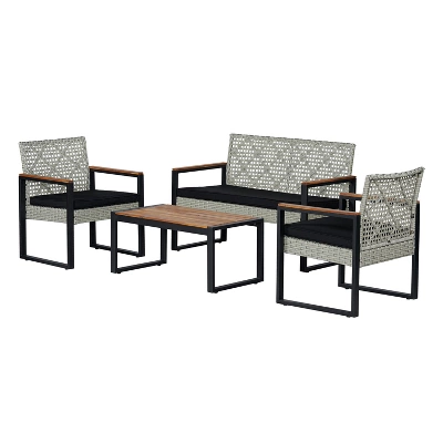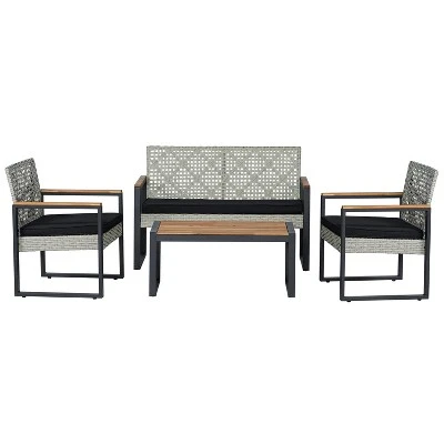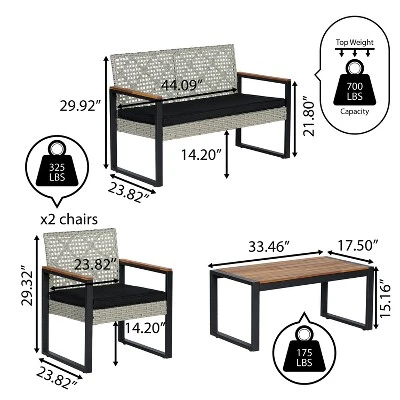 Add an urban touch to your deck or patio with our wood-trimmed 4-piece conversation set. The settee and two lounge chairs have durable synthetic wicker woven onto metal frames, with rustic wood planks on the arms and table top. With comfortable cushions covered in outdoor fabric, this patio set is ideal for a contemporary or farmhouse style home.